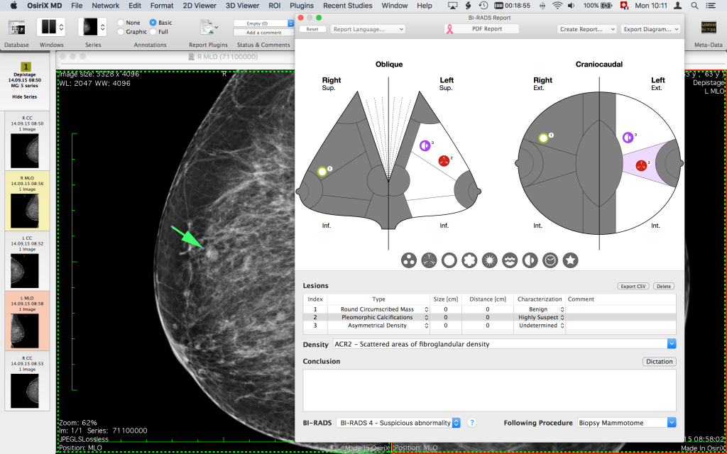 Breast Imaging-Reporting and Data System refers to a structured reporting scheme for mammography imaging techniques (mammography, ultrasound and MRI). The system is designed to standardize reporting, and is used to communicate a patient’s risk of developing breast cancer. This plugin offers a full graphic user interface to easily create explicit BIRADS diagrams. The plugin produces a complete report, including diagrams, in high quality DICOM PDF format. Learn more in the BI-RADS Report Plugin User Manual.